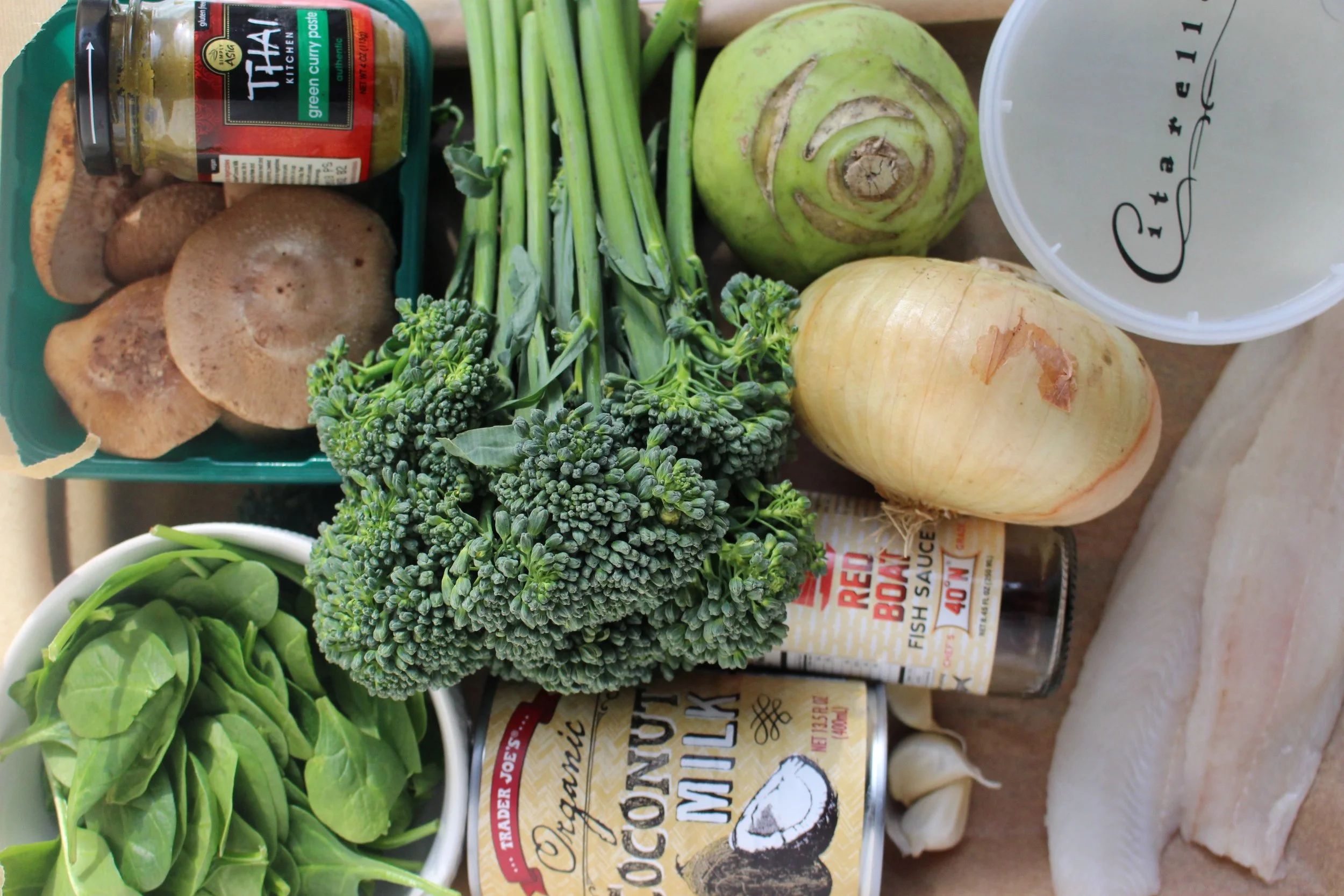 So, Green Curry Fish Stew! It's a very delicious vehicle for vegetables and while not technically "hiding" them, the vegetables become part of a whole and don't taste like themselves necessarily. When M was a baby, one of his favorite purees from Baby Foode was chicken, carrots, mango, and Thai red curry paste, so he's always liked these flavors.