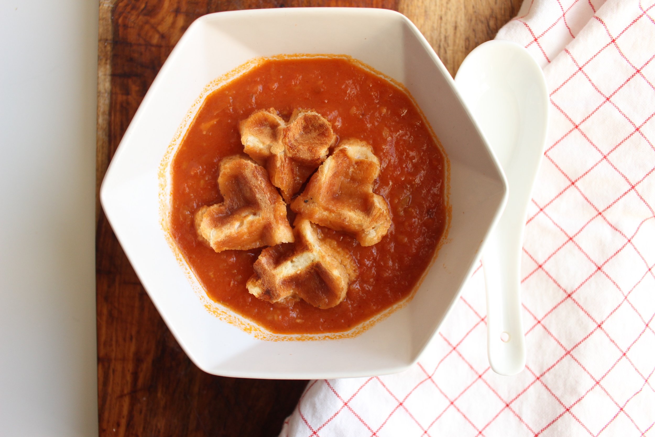 Well, we're two months into official winter and it FINALLY snowed for real in NYC. We've had some accumulation here and there, but it was always sandwiched between 50-degree days and melted right away. The only things I like about snow are the quiet, dampened hush that blankets even this manic city, and the excuse to make tomato soup and cheese waffles. Grilled cheese is the typical tomato soup accessory, but I've made these waffles for M a few times this winter and it was time to break them out again.