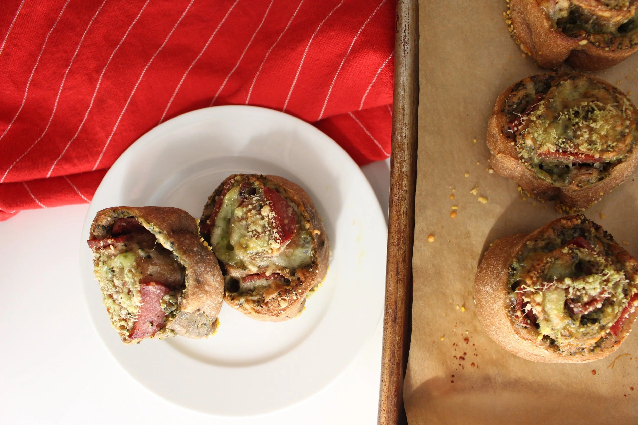 We love pizza around these parts, but pizza doesn't always love us. A toddler with pizza grease and tomato sauce all over him is just a prelude to an APARTMENT with pizza grease and tomato sauce all over it. These rolls help a lot! Using homemade pesto means you can control the amount of grease. Encasing everything in dough also keeps the toppings from topping your home. These rolls also keep well in the fridge or freezer as long as they're re-crisped well in the toaster or the oven before being eaten.