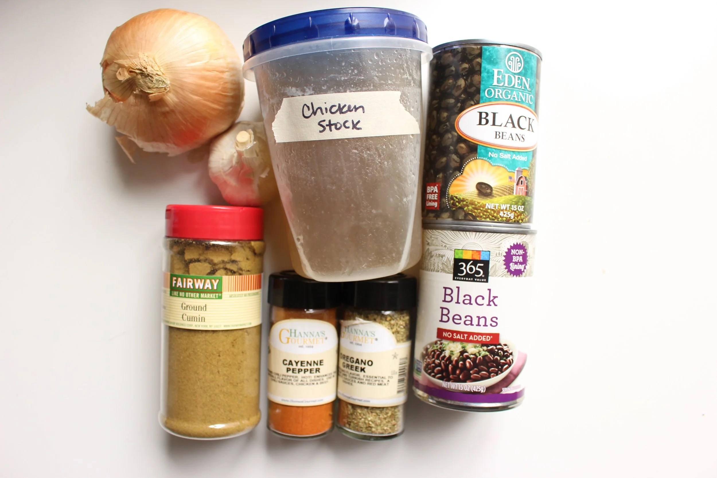 Add 1.5 cans of black beans and chicken stock and bring to a boil. Reduce heat to low and simmer, covered, for 30 minutes. Let cool slightly, and using an immersion or regular blender, puree the soup. Add the other .5 cans of beans, salt and pepper to taste, and heat through again.