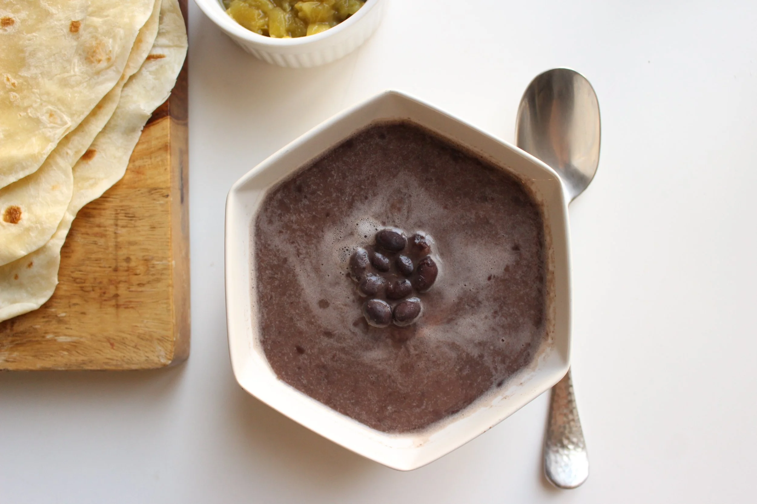 A few notes: 15 minutes is a long time for onions to start a soup, but the caramelizing really enhances the flavor of this simple dish. Also, this soup is of a medium thickness. If one wanted a thicker soup, reduce the liquid by 1 cup. Similarly, to thin the soup further, add 1/2 to 1 cup more liquid. I like the textural difference of some pureed and some whole beans, but one could also puree the whole thing for a uniform consistency. Other ways to add texture: Set side some caramelized onions for later topping; add in a small can of poblanos or other roasted, chopped green chilis; top with crushed tortilla chips, cojita cheese, cilantro, chopped tomatoes, etc for faux nachos on top.