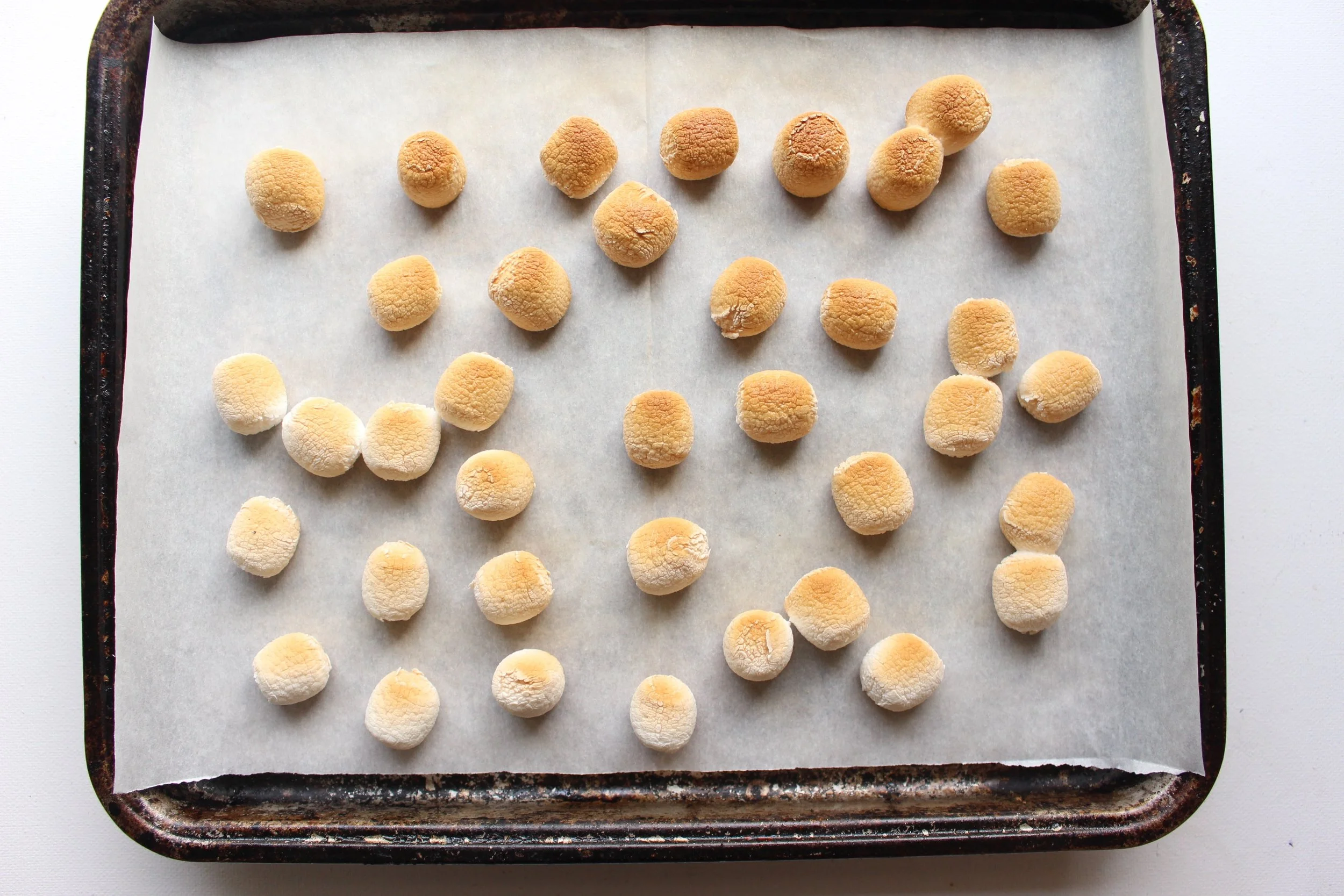 On a parchment-lined baking sheet, place your mini marshmallows so that none are touching. Toast them in an oven or toasted oven heated to 400 for about 1-2 minutes. The regular oven will toast the marshmallows very quickly, so watch them like a hawk. You can even leave the door open slightly to make sure that the marshmallows don’t burn too quickly. The toaster oven is somewhat easier to control, but you still have to watch the marshmallows very closely.
