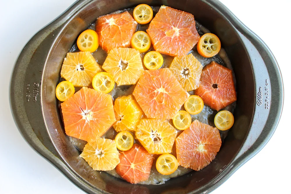 Top with the cake batter and smooth out gently so you don’t move the citrus.