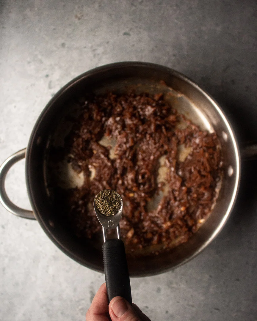 Turn the heat up to medium high and add the onions. Cover and cook, for 2-3 minutes until the onions begin to brown and stick to the bottom of the pan. Pour in about 2 -4 Tbsp of water and scrape the brown bits from the bottom of the pan. Cover and cook for 2-3 more minutes and repeat the process. Continue cooking until the onions are a deep brown color, about 20-25 minutes.